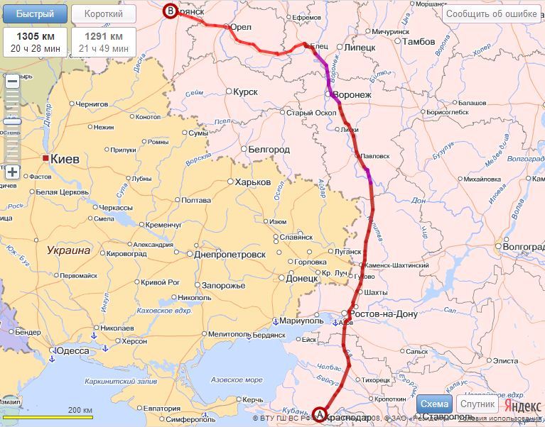 Грузоперевозки Краснодар Брянск - карта маршрута
