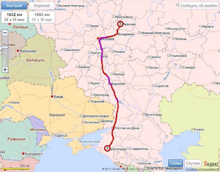 Грузоперевозки Краснодар Иваново. Расстояние 1632 км. Время в пути 24 ч 55 мин. Промежуточные крупные города - Краснодар, Ростов-на-Дону, Богучар, Елец, Москва, Владимир, Иваново
