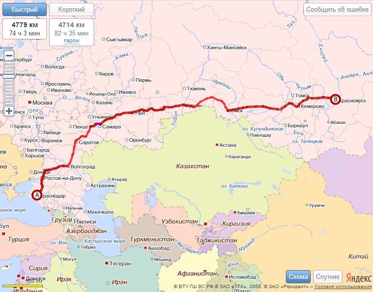 Грузоперевозки Краснодар Красноярск. Расстояние 4779 км. Время в пути 74 ч 3 мин. Промежуточные крупные города - Краснодар, Ростов-на-Дону, Шахты, Морозовск, Волгоград, Саратов, Самара, Уфа, Омск, Кемерово, Красноярск