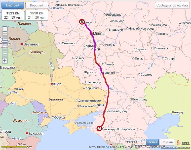 Грузоперевозки Краснодар Тверь - карта маршрута