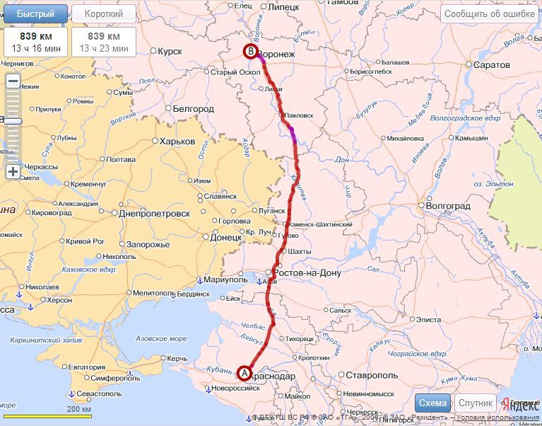 Грузоперевозки Краснодар Воронеж. Расстояние 839 км. Время в пути 13 ч 16 мин. Промежуточные крупные города - Краснодар, Ростов-на-Дону, Богучар, Воронеж