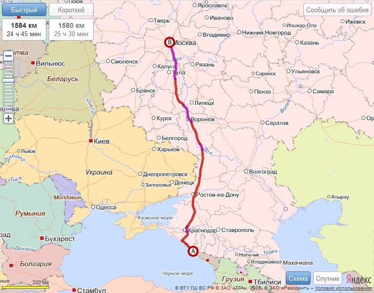 Промежуточные крупные города - Сочи, Дагомыс, Туапсе, Джубга, Краснодар, Ростов-на-Дону, Воронеж, Москва